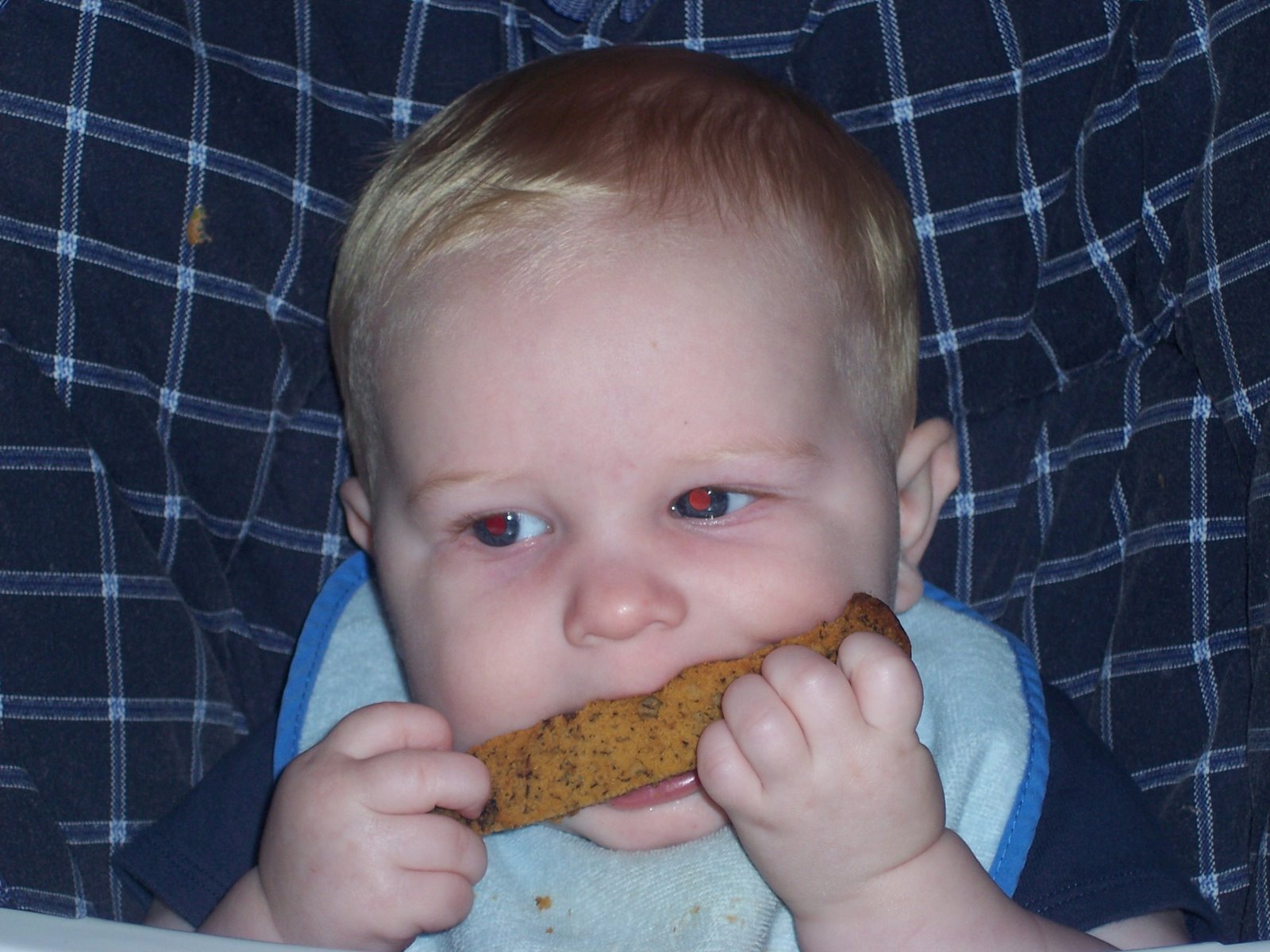 So Wyatt had his first taste of banana bread sticks last week! He desperately wants to eat food off our plates, so I figured it was time to bake a batch of bread sticks for the boy. Not surprisingly, he absolutely loved them. He's so happy!